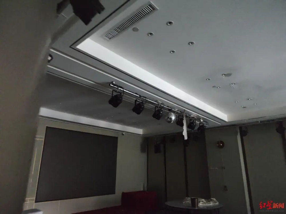 ▲起火大楼内一家饭店的包房,火灾后天花板渗水,地面全部湿透