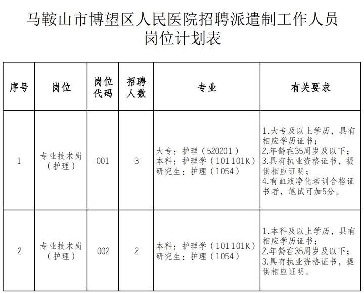 根据工作需要,马鞍山市人民医院博望分院面向社会公开招聘劳务派遣制工作人员,受马鞍山市人民医院博望分院委托,马鞍山市横望人力资源有限公司负责具体承办本次招聘工作,现将招聘有关事项公告如下: