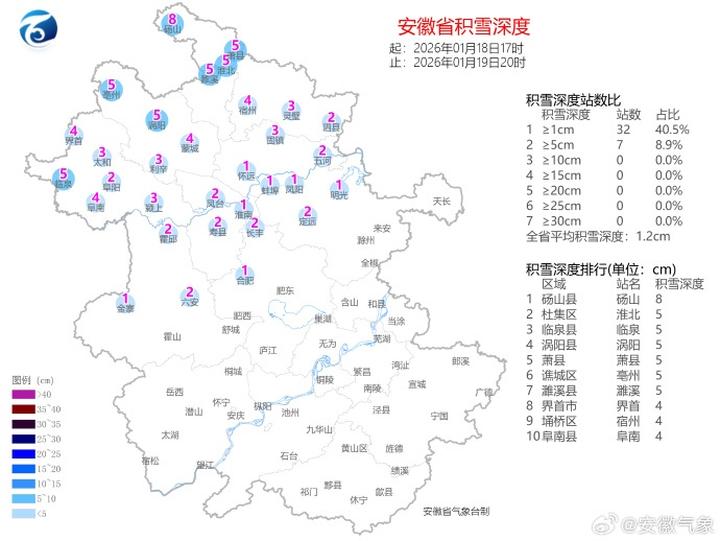 1月19日08时-20时,江北大部分地区有降雪,较强降雪主要出现在阜阳、亳州、宿州、淮北、蚌埠、淮南、六安,最大降雪量出现在亳州谯城区(8.5毫米)。