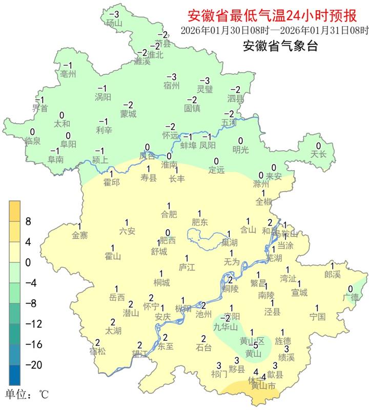 受弱冷空气影响,今明两天全省大部分地区平均气温将下降3~5℃,同时今天全省平均风力增大到3~4级,阵风7级。冷空气过后,2月1日早晨我省最低气温:淮河以北和本省山区-4~-2℃,江南南部0~2℃,其他地区-3~-1℃。2月1-4日全省气温将逐渐回升,4日淮河以北、江淮之间北部最高气温15~17℃,其他地区17~20℃。6日前后我省还有一次冷空气过程。