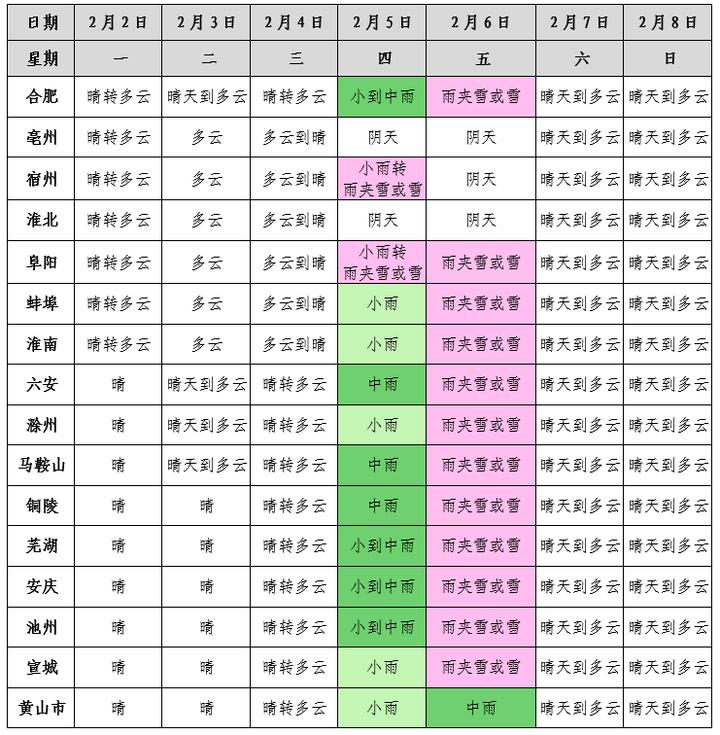 5日至6日全省有一次雨雪天气过程,其中5日夜间沿淮淮北部分地区有雨夹雪或雪,6日沿淮至沿江和江南部分地区有雨夹雪或雪;9日至10日安徽省还有一次弱降水过程。