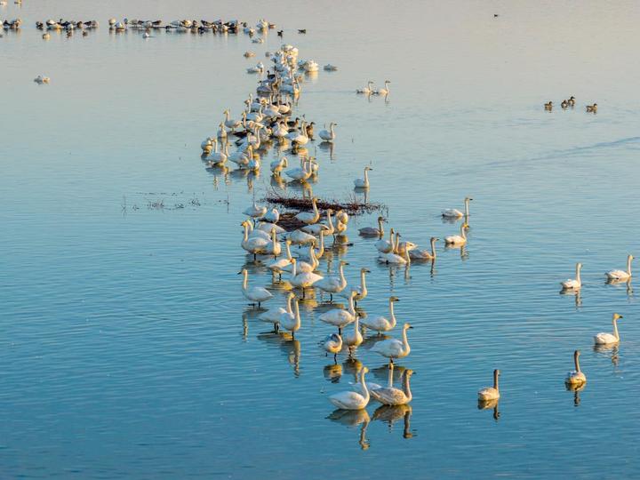 2025年11月30日,安徽贵池十八索省级自然保护区,成群小天鹅在湖面上悠然栖息。饶颐 摄