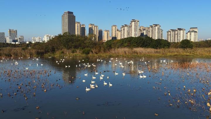 2025年11月20日,位于安徽省池州市主城区的月亮湖湿地迎来近300只小天鹅越冬。饶颐 摄