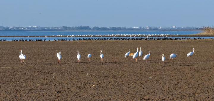 2025年11月25日,安徽升金湖国家级自然保护区,白鹤与鸬鹚、白琵鹭在滩涂与湖畔悠然栖息。饶颐 摄