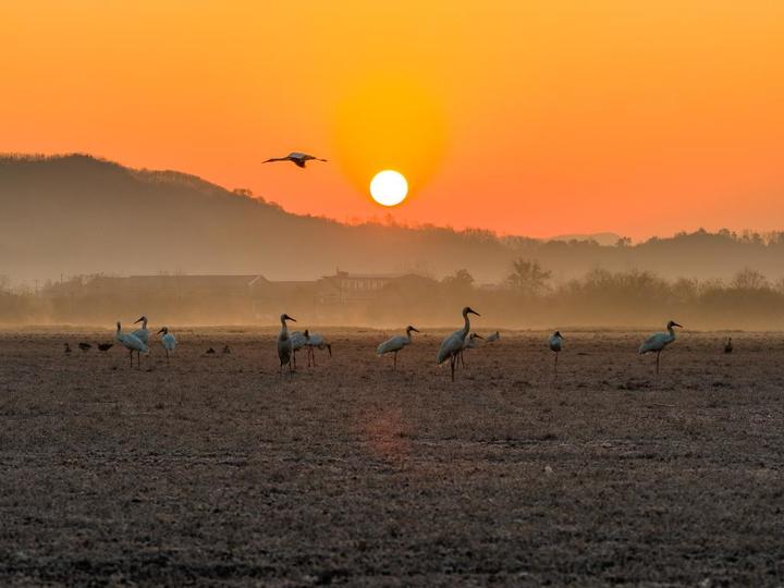 2026年1月8日,安徽升金湖国家级自然保护区,朝阳为大地铺就暖橙底色,白鹤群在薄雾笼罩的湿地上栖息、翩飞。饶颐 摄