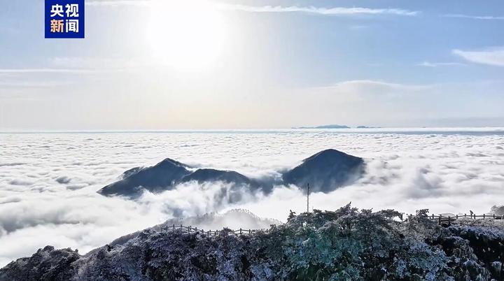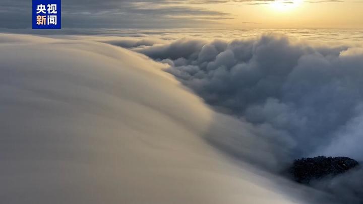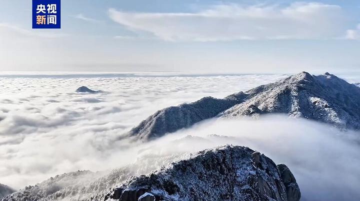 近日,安徽九华山风景区出现罕见流云奇景。流云穿峰而过,奔腾如涛。皑皑白雪为底色,云海翻涌,整座山如梦似幻。(总台记者 王宁 邵鑫扬)