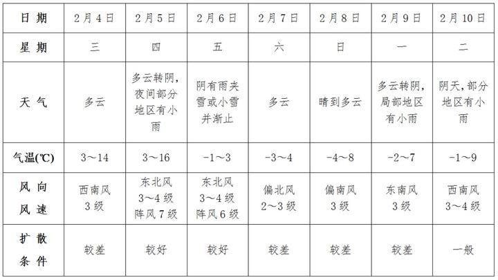 预计今天至明天白天我市气温逐渐回升,最高气温可升至14~16℃;受冷空气影响,5日夜间-6日白天将有一次降水降温天气过程,部分地区有雨夹雪或雪,积雪深度在1厘米左右,平均气温将下降7~9℃。近期大气扩散条件较差,夜间到早晨易出现大雾天气。
