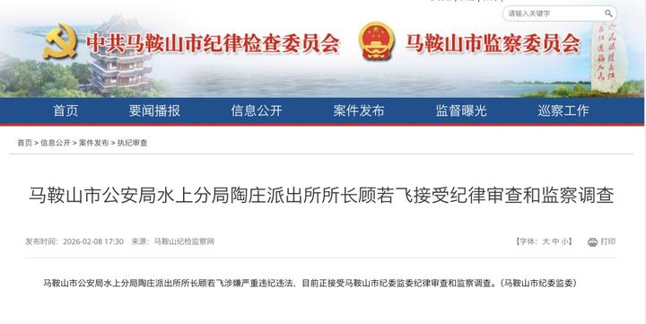 马鞍山市公安局水上分局陶庄派出所所长顾若飞涉嫌严重违纪违法,目前正接受马鞍山市纪委监委纪律审查和监察调查。(马鞍山市纪委监委)