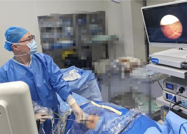 术中,李超团队在超声引导下,将穿刺针精准刺入囊腔内,建立起一个仅5毫米的工作通道,然后使用输尿管镜在直视下观察囊肿情况并做囊壁分离,最后用激光(钬激光或铥激光)将囊肿顶部切除,实现囊肿去顶减压。整台手术患者出血少、创伤小,真正实现了超微创效果。