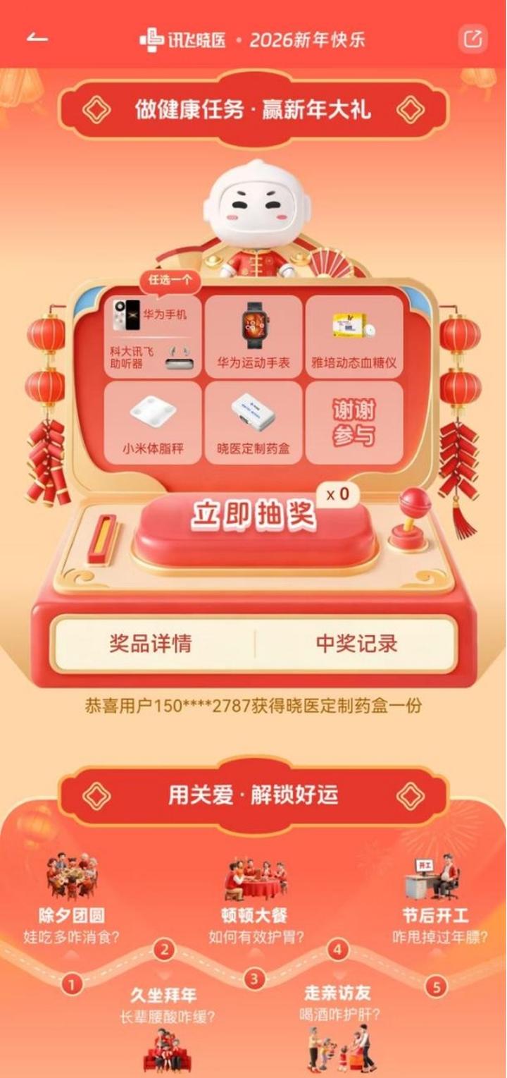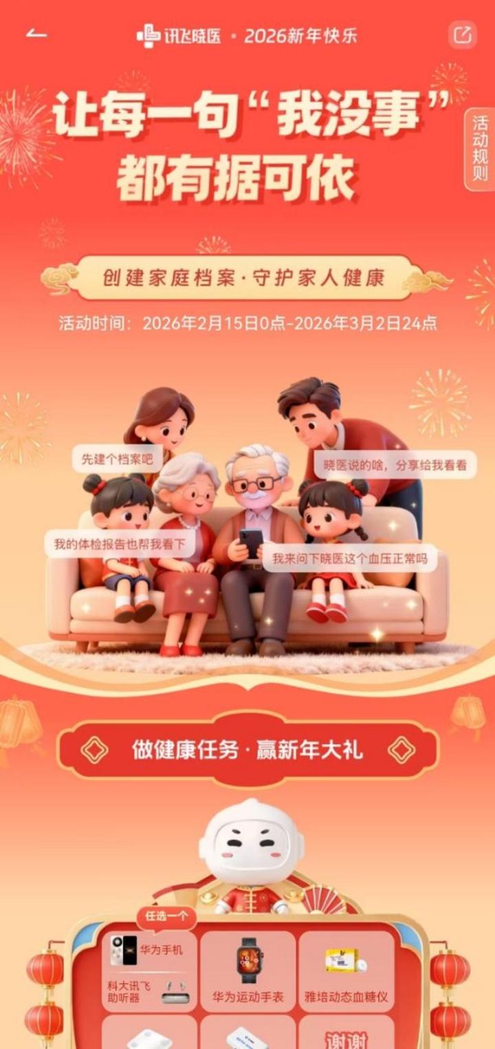 并且在春节假期期间(2 月 15 日~3 月 2 日),只需登录“讯飞晓医”APP完成版本升级,参与创建健康档案、解读报告单、为家人健康咨询等指定任务,就能参与抽奖!华为 Mate 80 等多重好礼等你来拿!