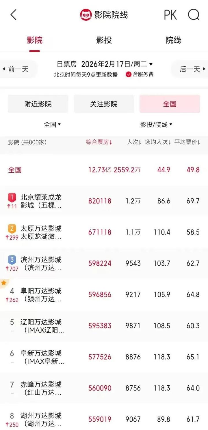 其中阜阳万达影城昨日综合票房