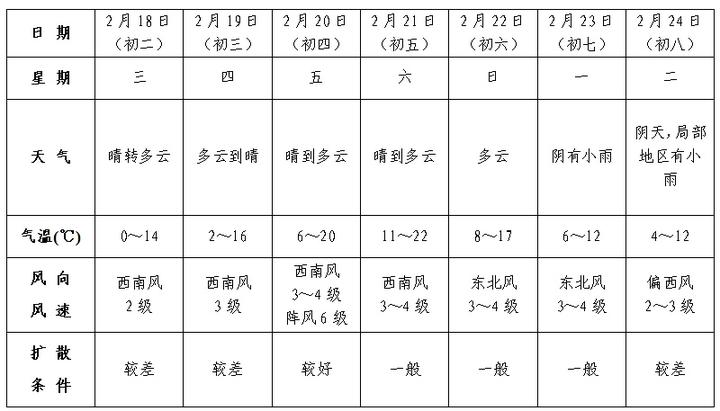 扩散条件:20日(初四)平均风力3~4级,阵风6级左右;其余时段平均风力3级左右,扩散条件偏差或一般。
