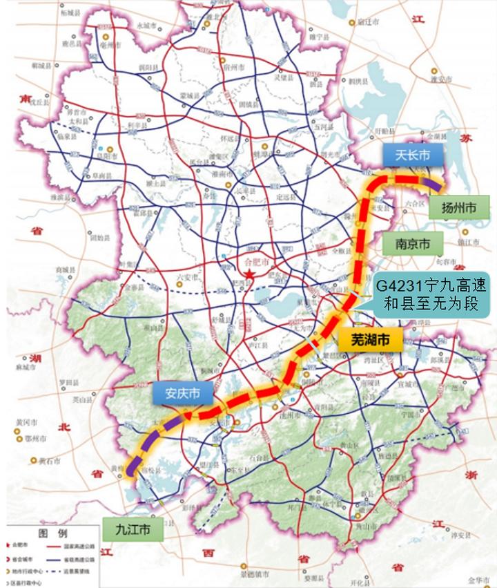 G4231南京至九江高速公路和县至无为段项目起点位于马鞍山市郑蒲港新区姥桥镇西北侧姥桥枢纽,线路整体呈东西走向,途经马鞍山市和县、含山县、郑蒲港新区以及芜湖市鸠江区、无为市,路线全长68.774公里。采用双向四车道全封闭高速公路标准建设,设计时速120公里。