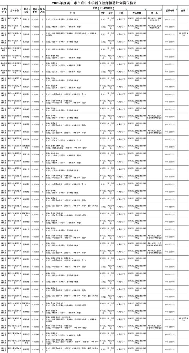 2026年度黄山市市直中小学新任教师公开招聘公告