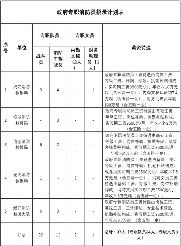 本次计划招收政府专职消防员37名。其中,战斗员岗位22名,消防车驾驶员岗位12名,内勤文秘岗位2名,财务助理员岗位1名。