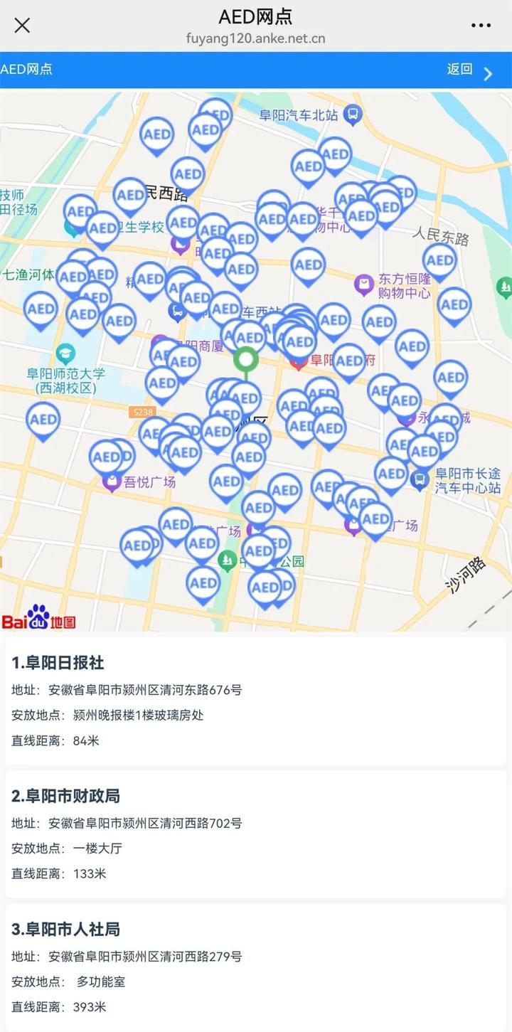 近年来,阜阳持续推进AED布点工作,在火车站、汽车站、学校、大型商场等人员密集场所逐步完善AED配置,搭建便捷的AED查询渠道,让“救命神器”触手可及。