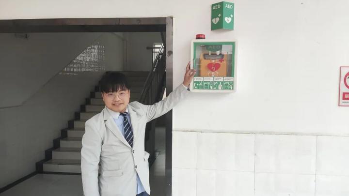 这台教学楼内的AED,拯救了文文的生命 (图中人物为老师)
