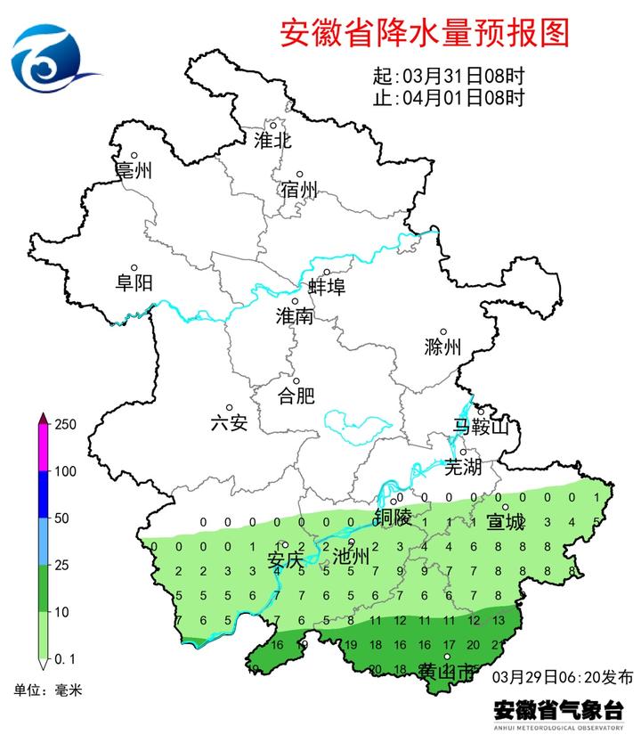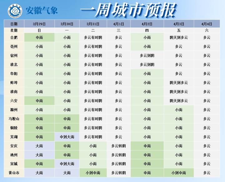 据安徽气象预报:29日夜里-30日白天我省有一次较明显降水过程,江淮之间南部和江南部分地区大雨,同时伴有短时强降水(最大小时雨强20~40毫米/小时)和雷电等强对流天气。31日沿江江南有降水。4月2-3日和5-6日我省还将分别有一次降水过程。