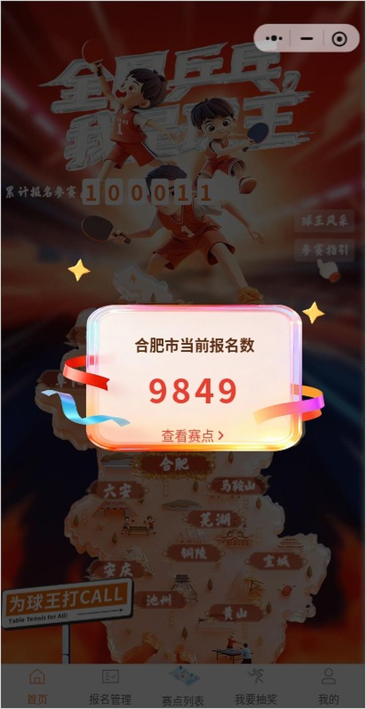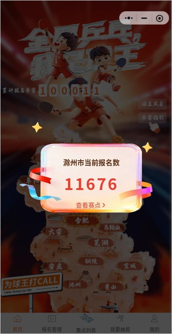 截至3月30日上午10点20分,“皖美运动汇”2026安徽省全民健身赛事季核心项目——“徽乒赛”全省报名人数正式突破100000人次!