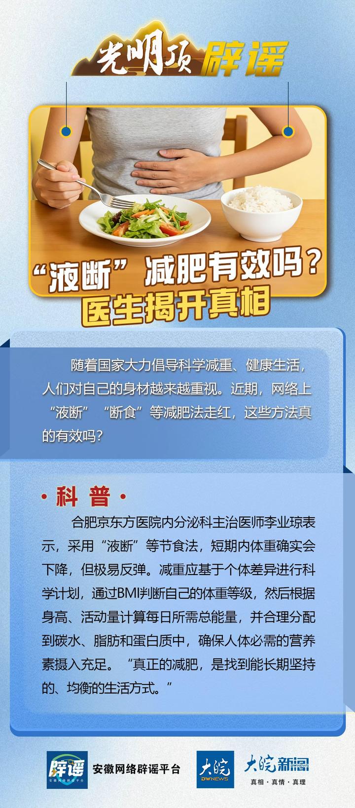 +订阅大皖新闻讯 随着国家大力倡导科学减重,健康生活,人们对自己的身材越来越重视。近期,网络上“液断”“断食”等减肥法走红,这些方法真的有效吗?