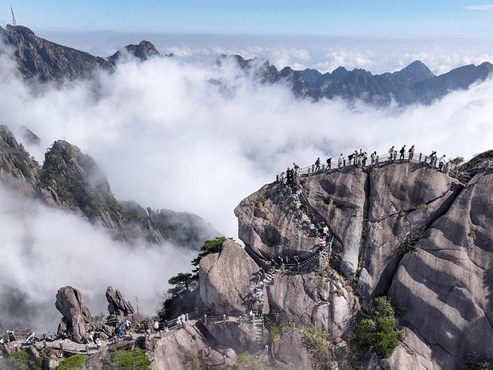 2025年4月23日,游客在安徽省黄山风景区天都峰处登山游玩。