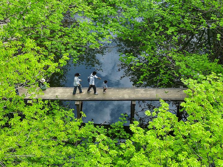 2025年4月7日,游客在安徽省黄山市徽州区西溪南湿地游玩踏青。