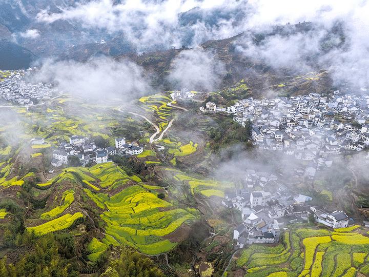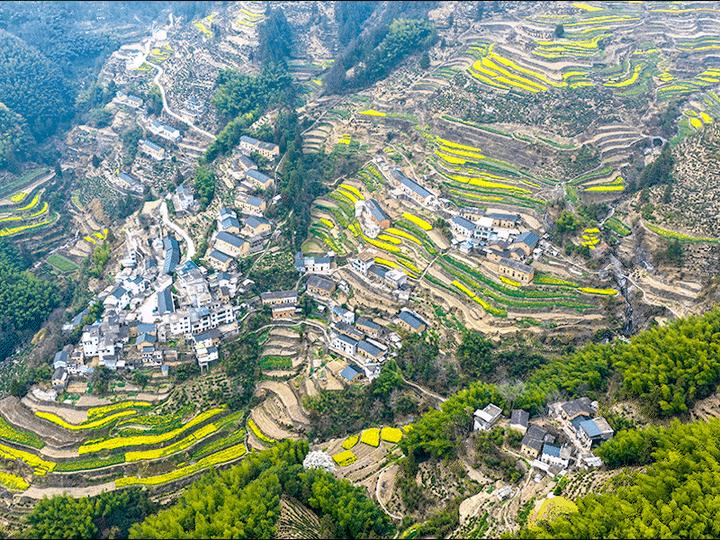 2026年3月16日,安徽省黄山市歙县长陔乡谷丰村,层层叠叠的梯田油菜花环绕着古朴的土楼民居。
