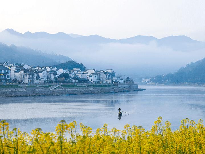 2026年3月11日,在安徽省黄山市歙县深渡镇漳潭村新安江畔拍摄的春日晨景。
