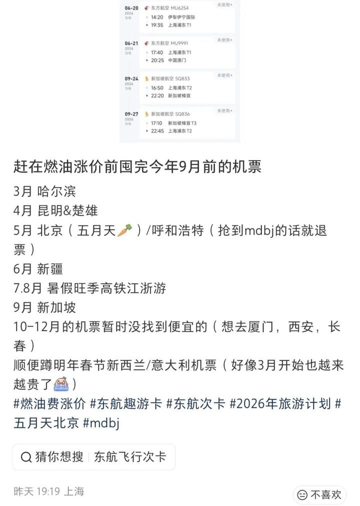 不少网友在社交平台发帖称,赶在燃油附加费上涨前提前囤购了机票“能买的都买了”,有人甚至买好了,2026年一整年的机票。