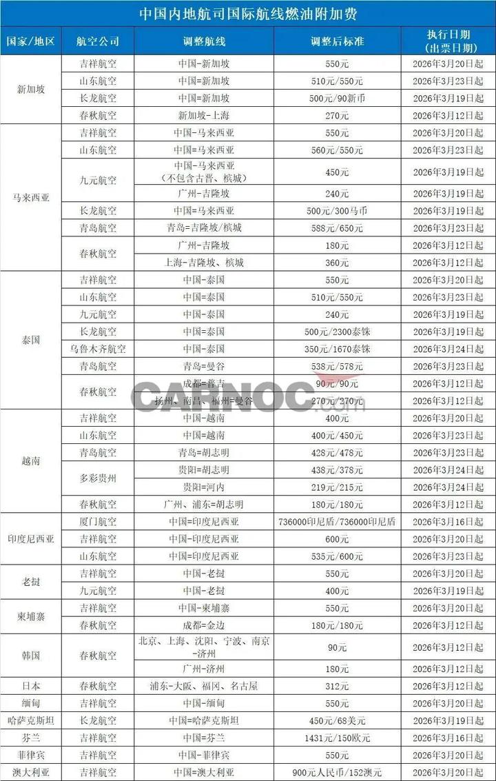 此前,国内春秋、吉祥、东航、长龙航空多家航空公司已经发布公告,调整了国际航线的燃油附加费,涨幅普遍在50%以上,部分航线甚至翻倍。其中,春秋航空上海至吉隆坡、槟城由180元上调至360元。南航向票代发布通知,受国际燃油价格调整影响,将分批调整国际航班燃油附加费,其中中国到东南亚上调100元,中国到澳洲上调270元,中国到阿联酋上调150元,中国到美国经济舱上调250元,公务舱上调500元。