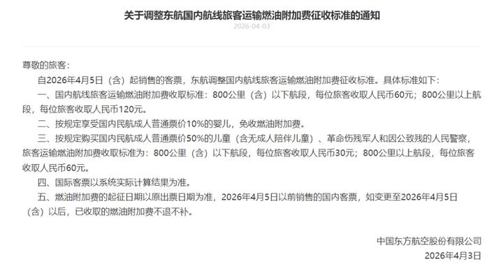4月3日,东方航空、上海航空相继发布通知,自2026年4月5日(含)起销售的客票,调整国内航线旅客运输燃油附加费征收标准。具体如下: