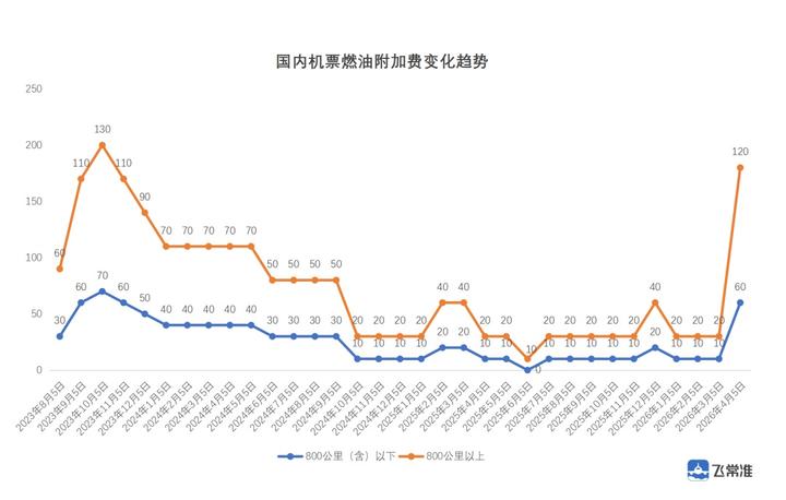 根据民航行业规则,国内航线旅客运输燃油附加费与航空煤油基础价格实行联动机制,当国内航空煤油综合采购成本超过每吨5000元时,航司可按规定收取燃油附加费,且每月5日为固定调价窗口。目前国内仍执行1月5日调整的燃油附加费标准,即800公里以下航段每人10元、800公里以上航段每人20元。
