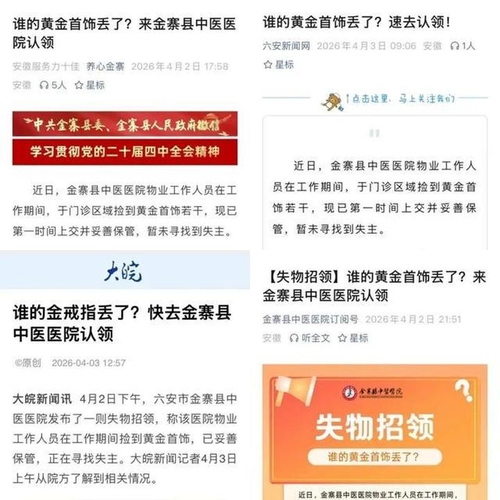 事情源于此前,医院物业工作人员在门诊区域日常巡检时,意外拾获三枚黄金戒指。考虑到首饰价值不菲,且可能对失主有特殊意义,工作人员第一时间将戒指上交医院,由专人妥善保管。为尽快找到失主,医院迅速发布失物招领公告,通过养心金寨、六安新闻网等多家媒体,详细说明捡拾情况和认领流程,并公布24小时联系电话,呼吁市民帮忙转发扩散。