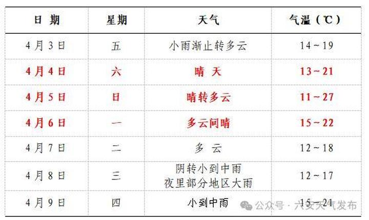 气温:4-6日全省最高气温在20℃以上,其中5日最高气温可达25~28℃。受冷空气影响,7日江淮之间和8日全省最高气温下降至16~19℃。