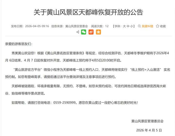 经过漫长冬季封闭轮休的天都峰,将于2026年4月7日起全面恢复对外开放。