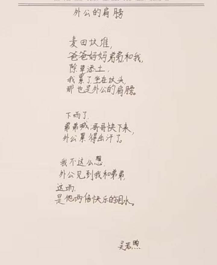 今年10岁的吴若煦在合肥市大通路小学长乐校区读四年级。他在“给春天的悄悄话”投稿中这样写道:“麦田坟堆,爸爸妈妈弟弟,和我,除草,添土。我累了,坐在坟头,那也是外公的肩膀。下雨了,弟弟喊:哥哥快下来,外公累得出汗了。我不这么想,外公见到我和弟弟,这雨,是他两倍快乐的泪水。”