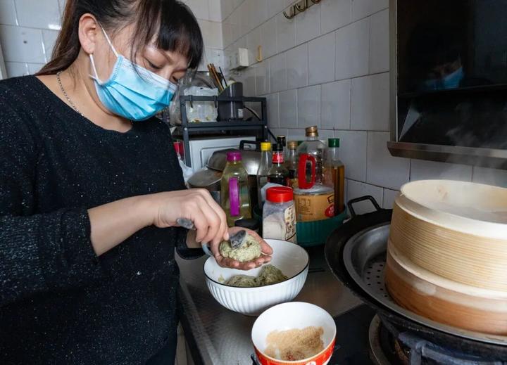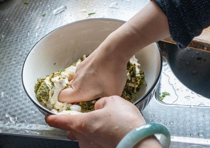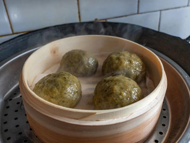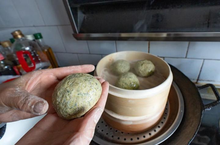 龙孟花将新鲜采摘的清明菜清洗、熬煮、切碎、挤干,经过多道工序,与优质糯米粉、面粉反复揉搓,化作色泽青绿的面团,然后手工分剂、包入自己家的秘制馅料,封口后上笼蒸制。