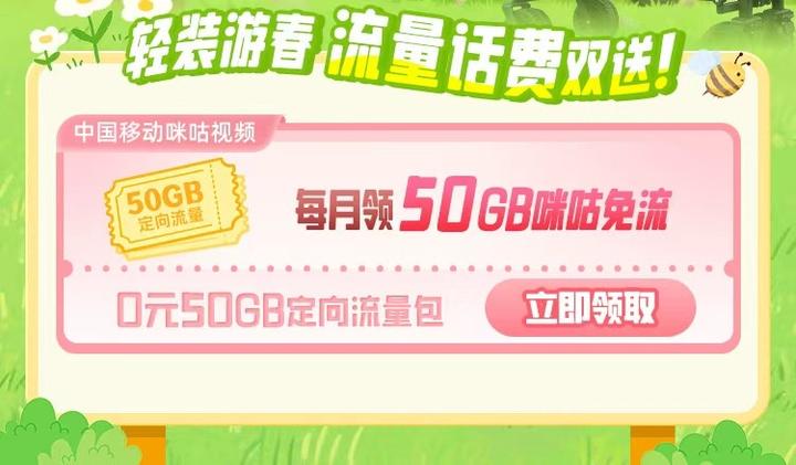 中国移动在网用户(不含中国港澳台地区、北京地区用户)每月可领取咪咕视频50GB定向流量包,资费0元。