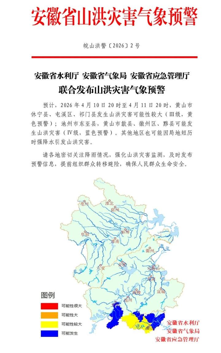 4月10日,安徽省水利厅、安徽省气象局、安徽省应急管理厅联合发布山洪灾害气象预警:预计,2026年4月10日20时至4月11日20时,黄山市休宁县、屯溪区、祁门县发生山洪灾害可能性较大(Ш级,黄色预警);池州市东至县,黄山市歙县、徽州区、黟县可能发生山洪灾害(IV级,蓝色预警)。其他地区也可能因局地短历时强降水引发山洪灾害。