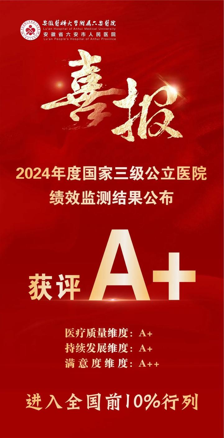 4月9日,国家卫生健康委公布2024年度全国三级公立医院绩效监测结果。六安市人民医院获评“A+”等级,在1658家全国三级公立综合医院中跻身前10%,取得历史性突破。
