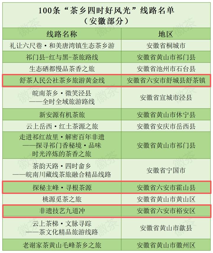 近日,在第五届茶乡旅游发展大会暨2026年西湖龙井春茶季活动中,全国100条“茶乡四时好风光”线路正式发布。六安市三条路线成功入选,分别是舒城县“舒茶人民公社茶乡旅游黄金线”、霍山县“探秘主峰·寻根茶源”、裕安区“非遗技艺九道冲”成功入选。