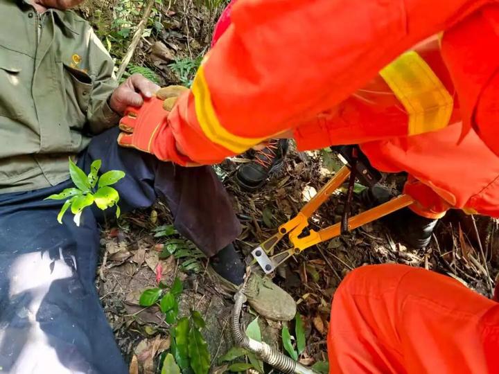 2026年4月9日,福建厦门一老人在山中不慎踩中捕兽装置,腿部被牢牢卡住无法脱身。接警后消防员迅速到场,仅用时约5分钟,便将捕兽装置剪断。