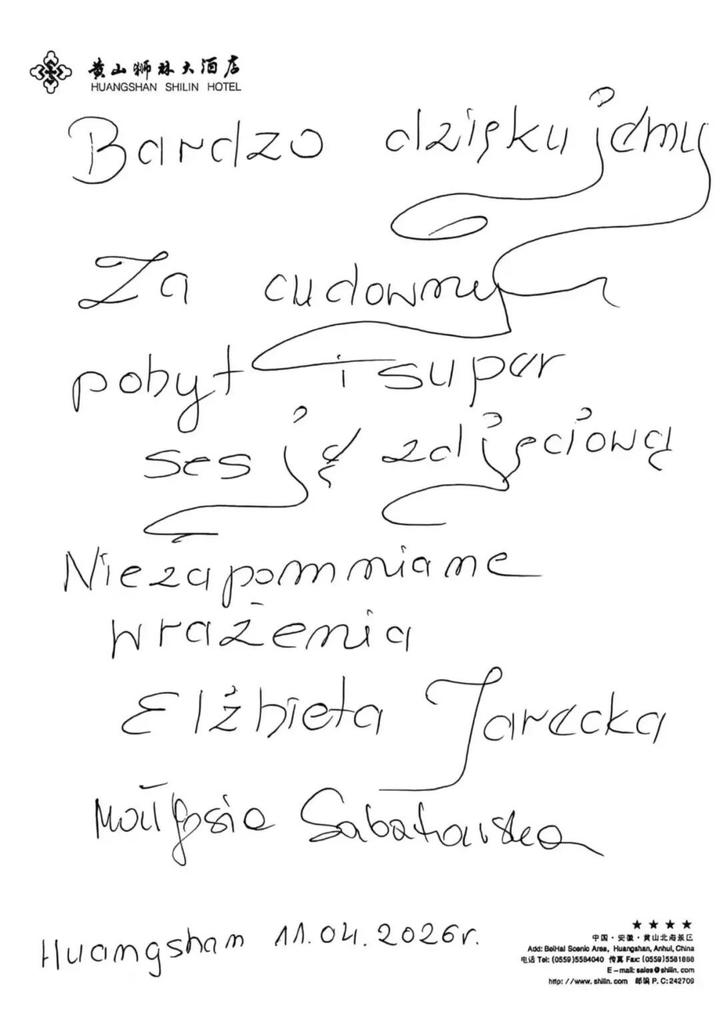 当精修照片呈现在手机屏幕上,Elzbieta Jarecka女士激动地拉住罗佳惠的手,连声说:“谢谢!谢谢你们!这不仅是一次完美的住宿体验,更是一场意想不到的文化之旅。”她当场写下一封感谢信表示:“完美的住宿体验,以及超棒的摄影服务——我们会永远铭记这美妙的黄山之夜!”