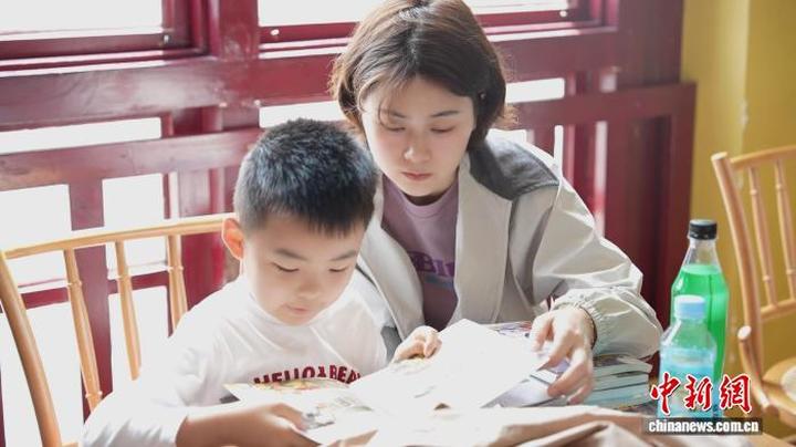 4月18日,胡代吟(右)带着孩子在前言后记店内阅读。刘鸿鹤 摄