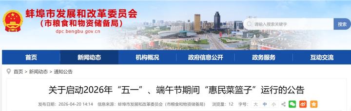 为保障节日市场平稳运行,促进节日市场消费,按照《安徽省发展改革委关于做好“五一”、端午节期间“惠民菜篮子”运行的通知》要求,定于2026年4月26日至5月5日、6月15日至21日,启动“五一”和端午节期间“惠民菜篮子”运行机制。