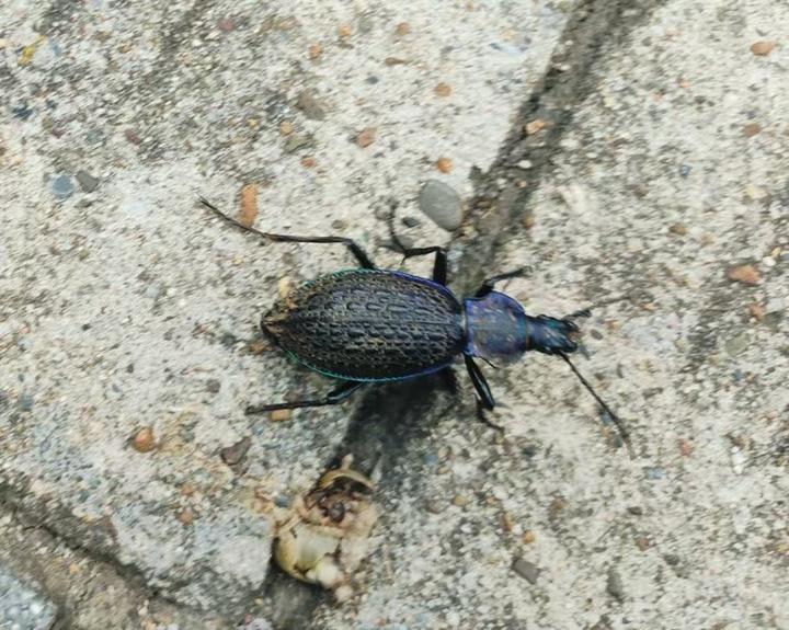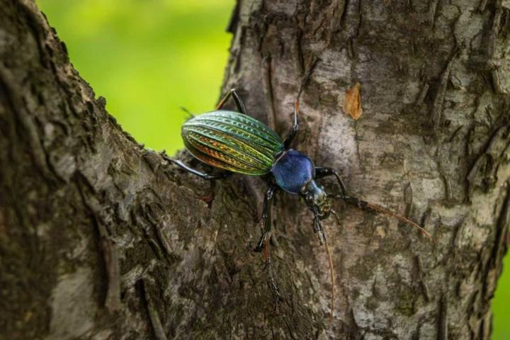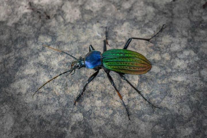 据了解,硕步甲又名大卫步甲,隶属于鞘翅目步甲科,是中国特有物种,主要分布于浙江、福建、江西、广东等南方省份,由于分布范围狭窄,且受到人为捕捉威胁较大,2021年,它被列入《国家重点保护野生动物名录》,成为少数受到国家二级保护的昆虫之一。硕步甲的“颜值”在甲虫中堪称出众,头部、触角和足呈黑亮色,胸部背面为藏蓝色,身披雕刻一般的“盔甲”,在阳光下呈现红铜色、金绿色交织的五彩金属光泽,如同一件行走的艺术品。尽管拥有一对漂亮的鞘翅,硕步甲却不善于飞翔,但它拥有另一项绝活——奔跑。它的足部细长有力,行动极为敏捷,素有“昆虫中的猎豹”之称。硕步甲是凶猛的肉食性昆虫,昼伏夜出,专门捕食鳞翅目幼虫、蜗牛、蛞蝓、蚯蚓等小型动物,是农田中重要的捕食性天敌和益虫。