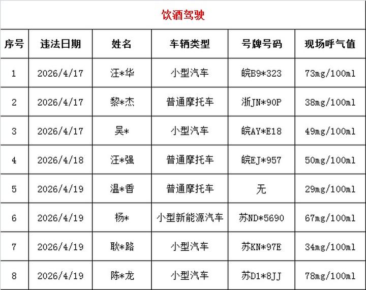 4月17日20时许,高新大队在林里路与瑞河路路口开展整治,其间,查获一摩托车驾驶人酒驾,现场检测结果为38mg/100ml,属于饮酒后驾驶机动车。