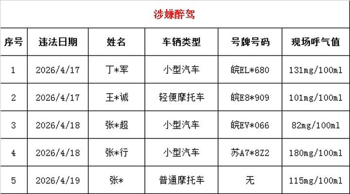 4月19日21时许,博望S445路段,一轿车驾驶人因酒后驾车被交警查获,其检测结果为180mg/100ml,涉嫌醉驾。
