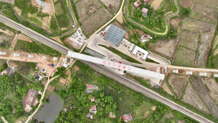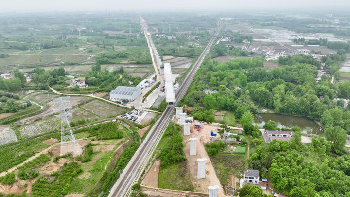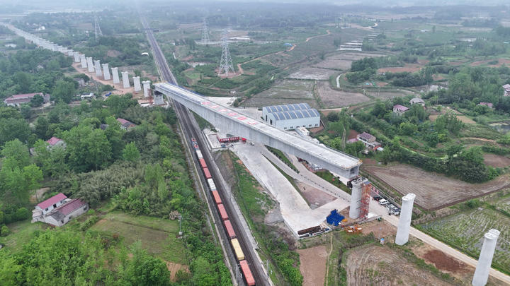 ↑4月21日拍摄的合武高铁跨宁西铁路万吨连续梁转体施工现场(无人机照片)。新华社记者 刘军喜 摄
