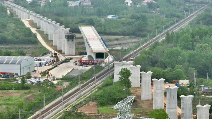 ↑4月21日拍摄的合武高铁跨宁西铁路万吨连续梁转体施工现场(无人机照片)。新华社记者 周牧 摄